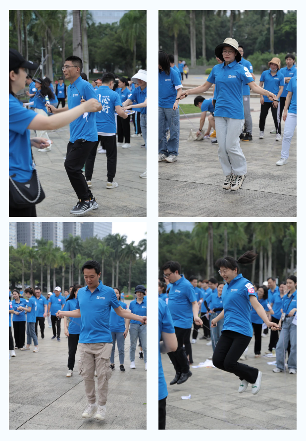 為了跑得更快、走得更穩(wěn),全體員工現(xiàn)場跟著活動健身教練的指令集體開展賽前熱身運動。在熟悉比賽規(guī)則后,隨著董事長一聲鳴笛響起,各小組隊伍迅速闖關(guān)出發(fā)。為增加健步走活動的趣味性與競技性,賽前需要完成跳繩方可出發(fā),5公里的路程需要完成收集任務(wù),而任務(wù)內(nèi)容便是集齊“l(fā)ogo+中、信、恒、泰”這5個貼紙。在終點,各小組成員需完成“青蛙跳”并展示所有貼紙。