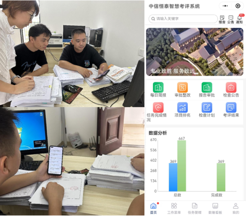 技術(shù)人員運(yùn)用中信恒泰智慧考評(píng)系統(tǒng)手機(jī)端,對(duì)項(xiàng)目進(jìn)行線上巡查