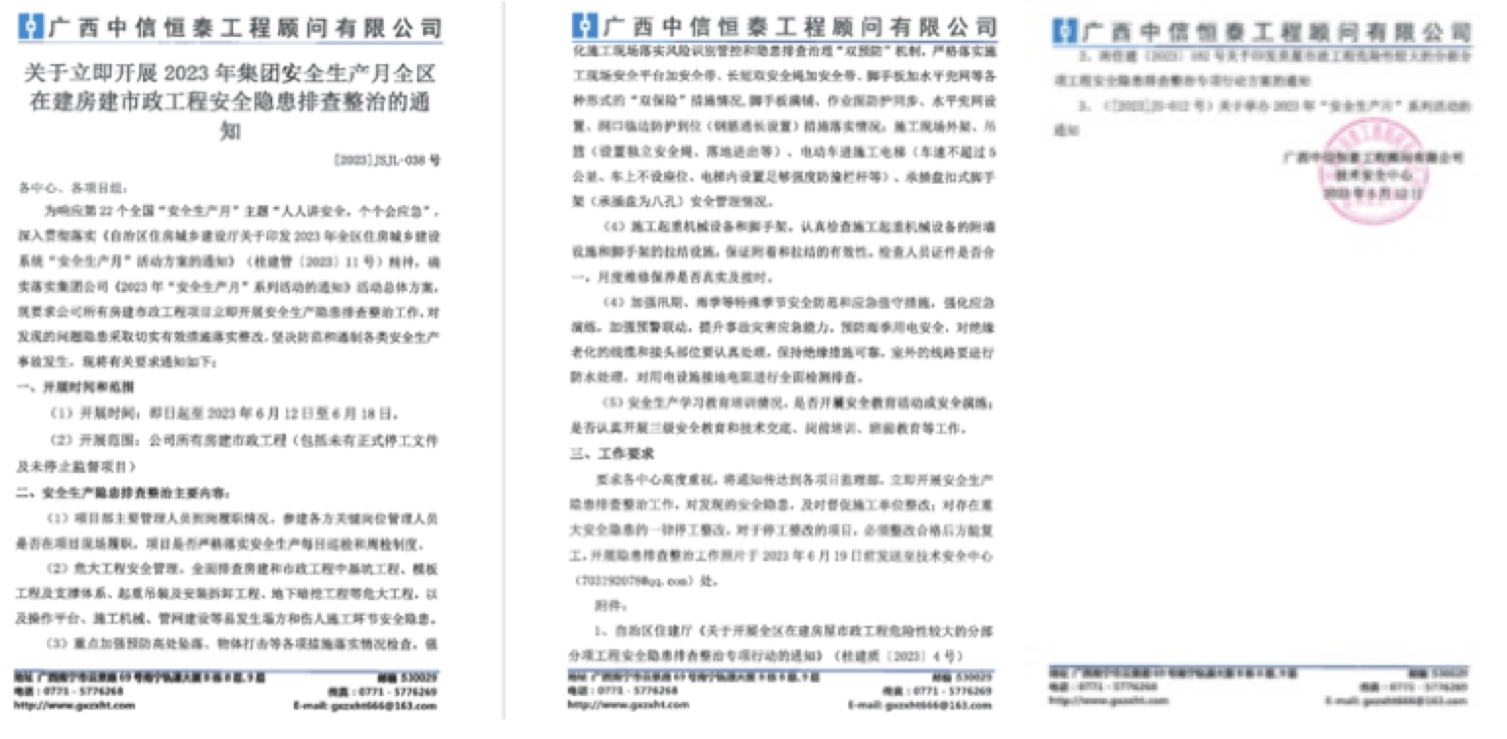 本次排查整治工作作為落實(shí)中信恒泰集團(tuán)2023年“安全生產(chǎn)月”的“六個(gè)一”系列活動(dòng)之一,集團(tuán)各中心、各分公司及項(xiàng)目部認(rèn)真貫徹落實(shí)自治區(qū)和南寧市住房和城鄉(xiāng)建設(shè)主管部門的通知要求,積極開(kāi)展安全隱患排查整治工作,確保查到位,改到位。安全責(zé)任重于山。接下來(lái),公司將強(qiáng)化本質(zhì)安全建設(shè),嚴(yán)格安全管理,不定期開(kāi)展安全隱患排查工作,以查促改,提升應(yīng)急能力,筑牢安全防線,確保安全工作措施落實(shí)到每個(gè)環(huán)節(jié)、每個(gè)工作崗位,真正做到“人人講安全、個(gè)個(gè)會(huì)應(yīng)急”,為公司高質(zhì)量發(fā)展夯實(shí)安全根基。