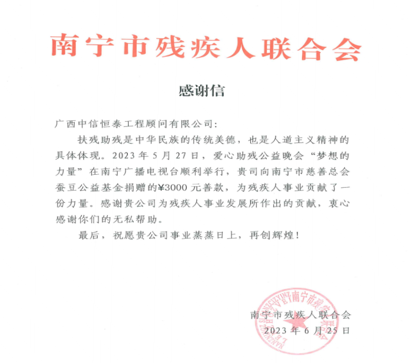 以愛(ài)心踐行責(zé)任,用行動(dòng)彰顯擔(dān)當(dāng)。近日,廣西中信恒泰工程顧問(wèn)有限公司收到南寧市人民政府殘疾人工作委員會(huì)、南寧市慈善總會(huì)、南寧市殘疾人聯(lián)合會(huì)發(fā)來(lái)的榮譽(yù)證書(shū)及感謝信,感謝中信恒泰對(duì)南寧市殘疾人事業(yè)發(fā)展的支持與幫助。