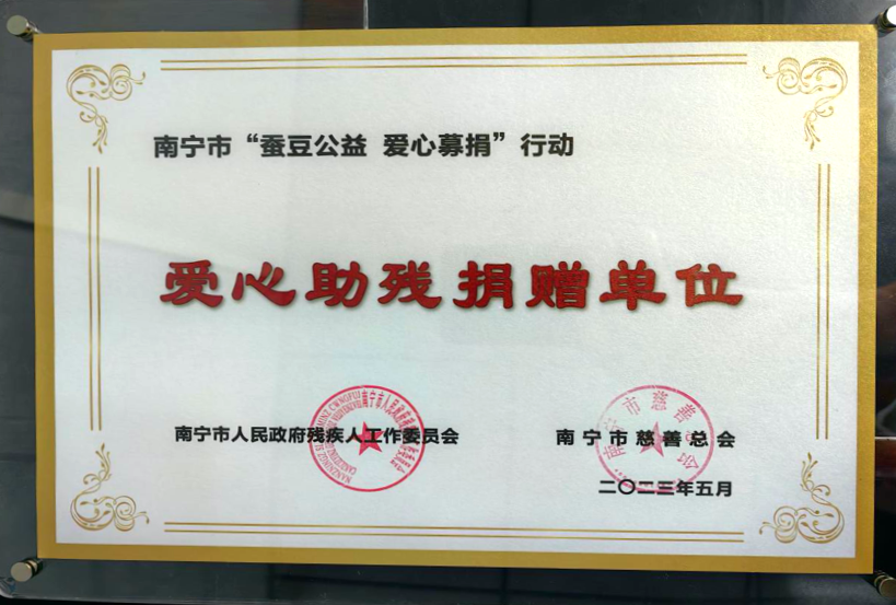 南寧市人民政府殘疾人工作委員會(huì)、南寧市慈善總會(huì)發(fā)來(lái)榮譽(yù)證書(shū)