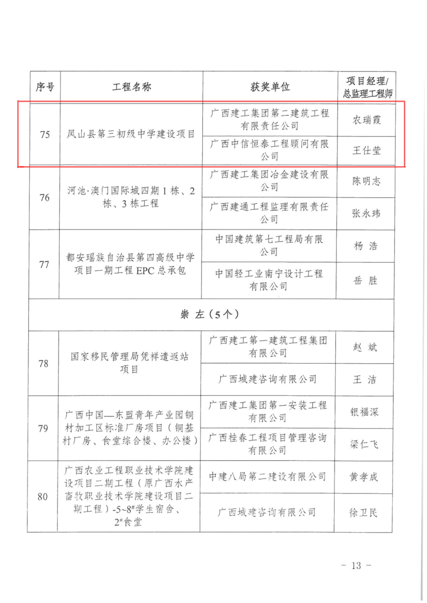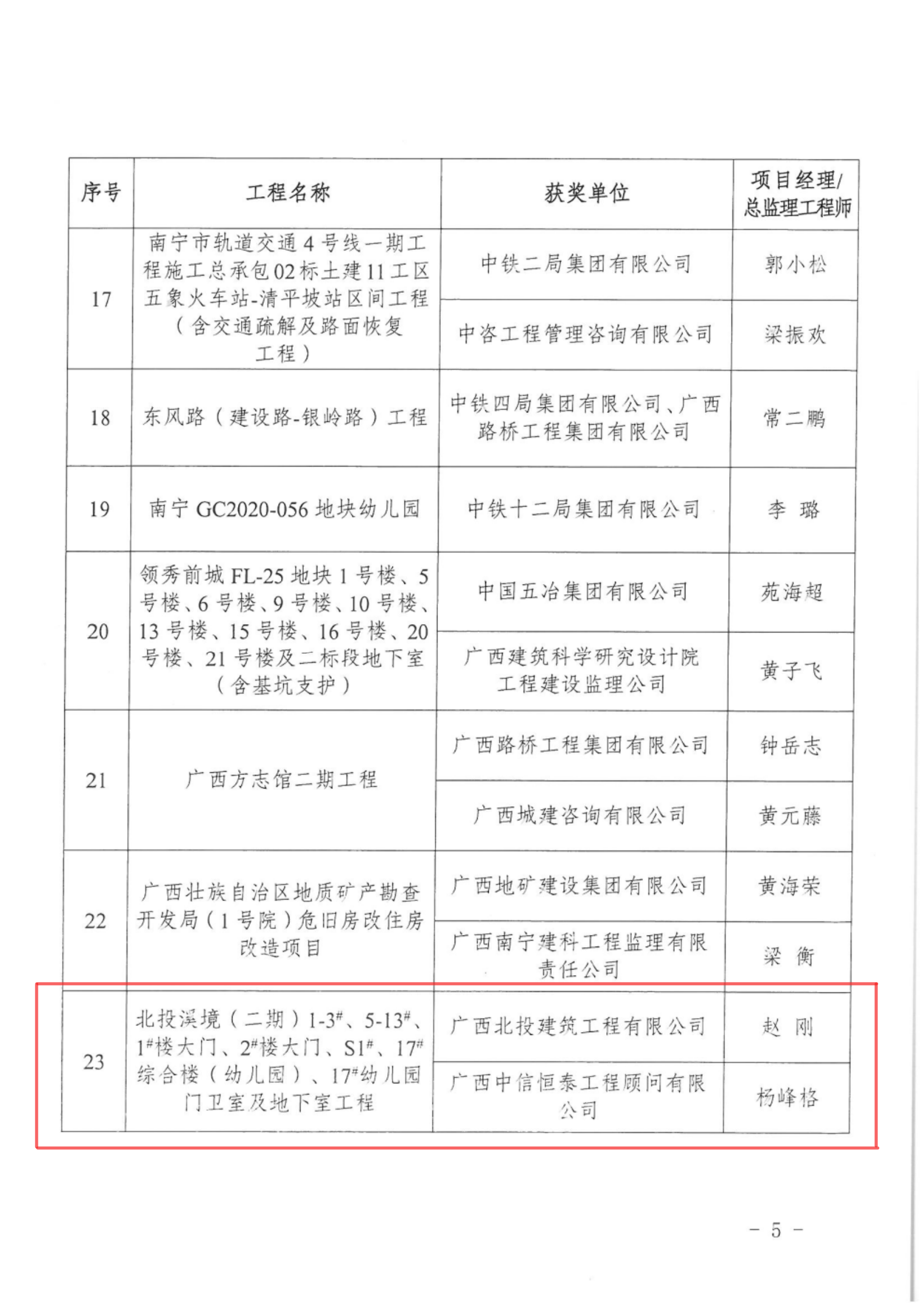 2023年7月24日,廣西工程建設(shè)質(zhì)量安全管理協(xié)會公布了2023年上半年廣西壯族自治區(qū)建設(shè)工程施工安全文明標(biāo)準(zhǔn)化工地名單,對獲獎項目及單位予以全區(qū)通報表彰。廣西中信恒泰工程顧問有限公司2個項目榮獲2023年上半年廣西壯族自治區(qū)建設(shè)工程施工安全文明標(biāo)準(zhǔn)化工地稱號。