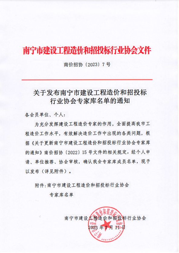 中信恒泰積極響應(yīng)南寧市建設(shè)工程造價(jià)和招投標(biāo)行業(yè)協(xié)會(huì)《關(guān)于更新南寧市建設(shè)工程造價(jià)和招投標(biāo)行業(yè)協(xié)會(huì)專家?guī)斓耐ㄖ纺蟽r(jià)招協(xié)〔2022〕15號(hào)文件要求,認(rèn)真組織申報(bào)、遴選,經(jīng)協(xié)會(huì)審核與公示,最終成功入選。