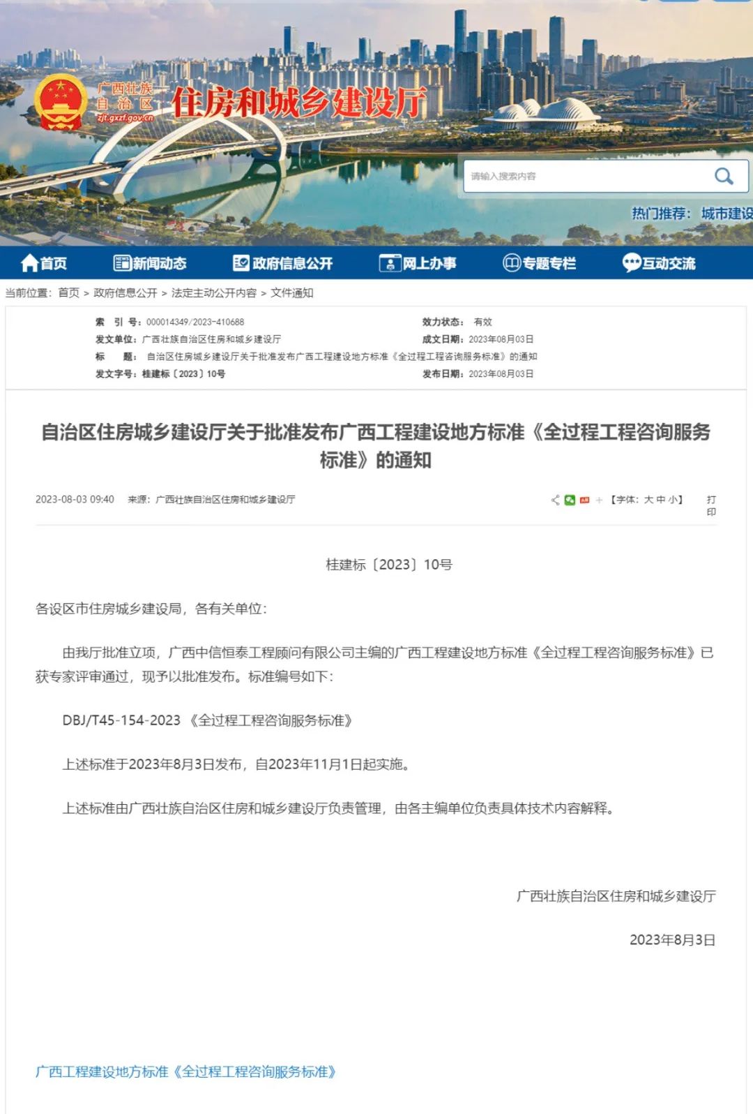由中信恒泰主編的廣西工程建設(shè)地方標(biāo)準(zhǔn)《全過程工程咨詢服務(wù)標(biāo)準(zhǔn)》將于2023年11月1日起實(shí)施