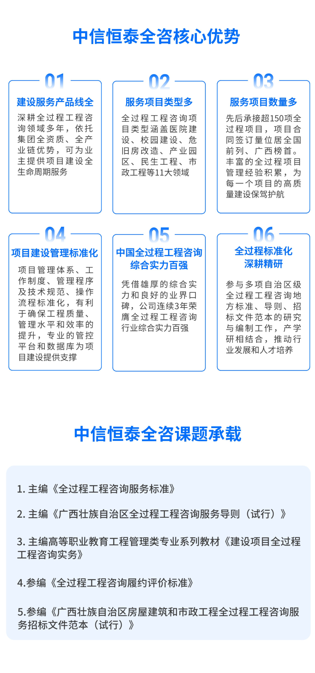 2023年8月3日,廣西壯族自治區(qū)住房和城鄉(xiāng)建設(shè)廳發(fā)布通知,正式批準發(fā)布廣西工程建設(shè)地方標準《全過程工程咨詢服務(wù)標準》(DBJ/T45-154-2023),自2023年11月1日起實施。該標準由自治區(qū)住房城鄉(xiāng)建設(shè)廳負責管理,主編單位中信恒泰負責具體技術(shù)內(nèi)容的解釋。