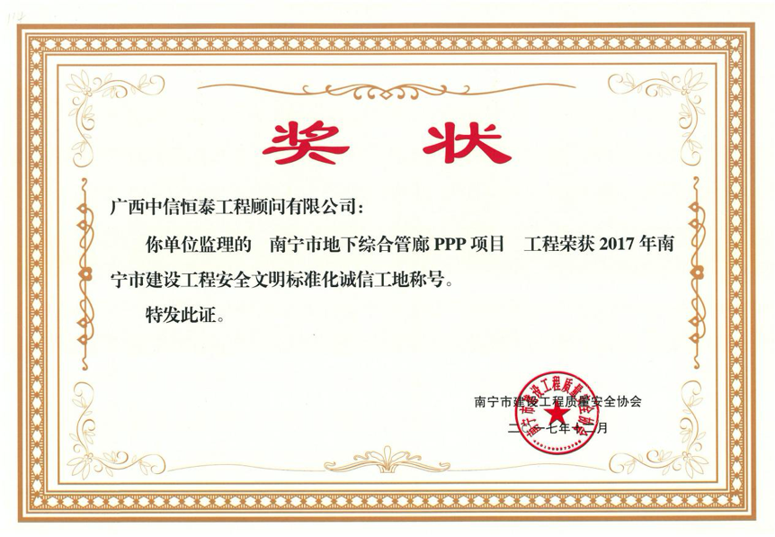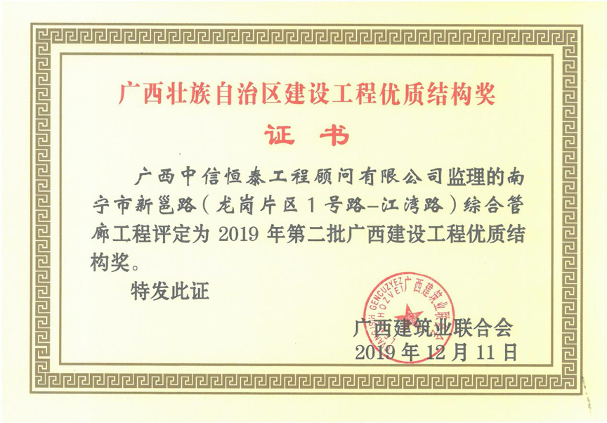 本項(xiàng)目為國(guó)家第二批管廊的試點(diǎn)工程,集團(tuán)領(lǐng)導(dǎo)高度重視,挑選精干人才,組織項(xiàng)目團(tuán)隊(duì)。項(xiàng)目建設(shè)期間,項(xiàng)目部在集團(tuán)的大力指導(dǎo)和支持下,精心組織、積極攻關(guān),嚴(yán)把工程質(zhì)量,嚴(yán)守安全底線,狠抓工程進(jìn)度,確保項(xiàng)目保質(zhì)保量完成,順利通過(guò)竣工驗(yàn)收。項(xiàng)目先后榮獲南寧市建設(shè)工程安全文明標(biāo)準(zhǔn)化誠(chéng)信工地、廣西建設(shè)工程優(yōu)質(zhì)結(jié)構(gòu)獎(jiǎng)、廣西建設(shè)工程“真武閣杯”獎(jiǎng)(最高質(zhì)量獎(jiǎng))等多個(gè)獎(jiǎng)項(xiàng)。