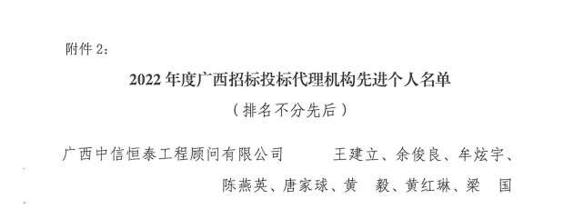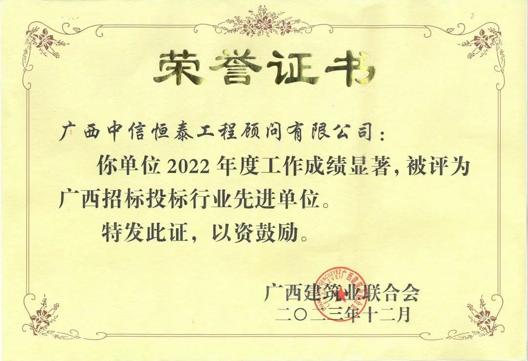 中信恒泰堅持“為客戶創(chuàng)造價值”的理念,不斷在業(yè)務(wù)實踐中積累、創(chuàng)新,在行業(yè)中始終保持領(lǐng)先水平和良好口碑,已連續(xù)13年榮獲“廣西招標投標行業(yè)先進單位”稱號,并多次榮獲全國招標代理機構(gòu)誠信先進單位、全國建設(shè)工程招標代理企業(yè)先進單位、中國招標投標“行業(yè)先鋒”、工程建設(shè)項目招標代理機構(gòu)30強等榮譽稱號。