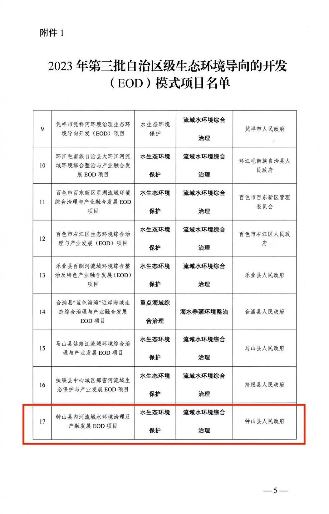近日,自治區(qū)生態(tài)環(huán)境廳與國開行廣西分行、農發(fā)行廣西分行公布了2023年第三批17個自治區(qū)級EOD項目,鐘山縣內河流域水環(huán)境治理及產融發(fā)展EOD項目順利入選本批項目名單。中信恒泰為鐘山縣內河流域水環(huán)境治理及產融發(fā)展EOD項目提供了全流程投融資策劃咨詢服務,為項目順利入庫提供了專業(yè)的技術服務。