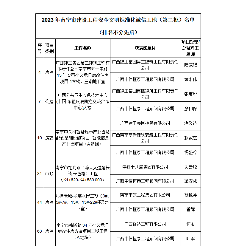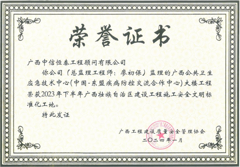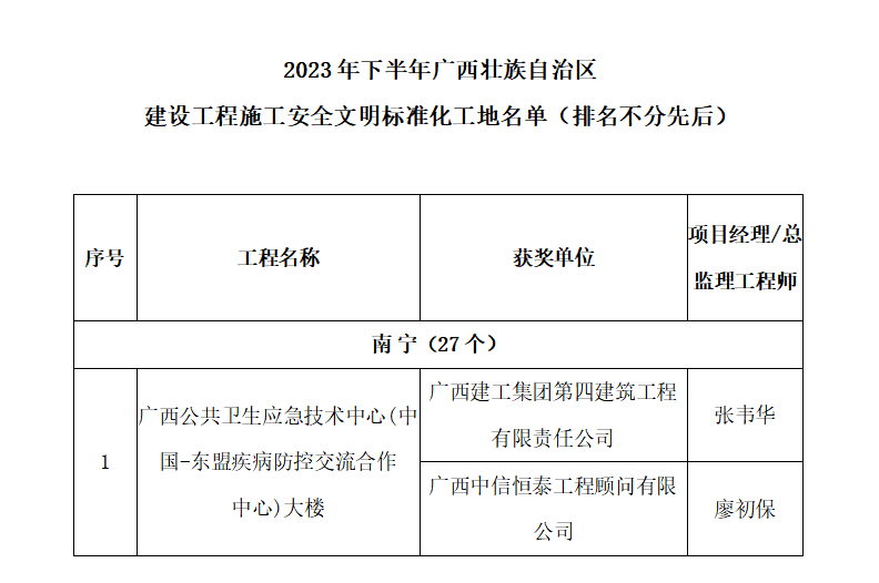 近日,廣西工程建設(shè)質(zhì)量安全管理協(xié)會、南寧市建設(shè)工程質(zhì)量安全協(xié)會分別公布了2023年下半年廣西壯族自治區(qū)建設(shè)工程施工安全文明標準化工地名單、2023年南寧市建設(shè)工程安全文明標準化誠信工地(第二批)名單。中信恒泰《廣西公共衛(wèi)生應(yīng)急技術(shù)中心(中國-東盟疾病防控交流合作中心)大樓》項目獲評2023年下半年廣西壯族自治區(qū)建設(shè)工程施工安全文明標準化工地,6個項目獲評2023年南寧市建設(shè)工程安全文明標準化誠信工地。