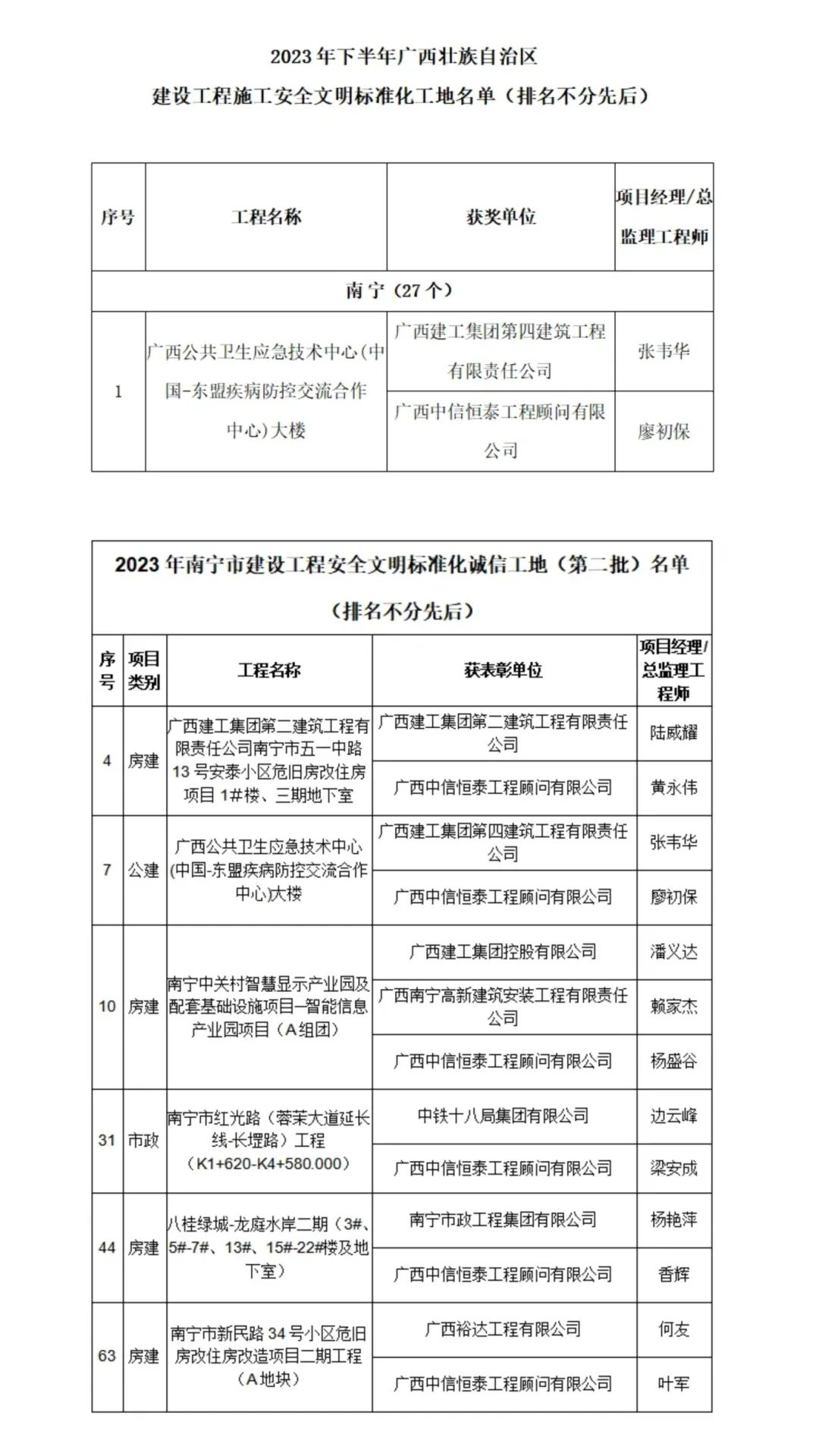 近日,廣西工程建設(shè)質(zhì)量安全管理協(xié)會、南寧市建設(shè)工程質(zhì)量安全協(xié)會分別公布了2023年下半年廣西壯族自治區(qū)建設(shè)工程施工安全文明標(biāo)準(zhǔn)化工地名單、2023年南寧市建設(shè)工程安全文明標(biāo)準(zhǔn)化誠信工地(第二批)名單。中信恒泰《廣西公共衛(wèi)生應(yīng)急技術(shù)中心(中國-東盟疾病防控交流合作中心)大樓》項(xiàng)目獲評2023年下半年廣西壯族自治區(qū)建設(shè)工程施工安全文明標(biāo)準(zhǔn)化工地,6個(gè)項(xiàng)目獲評2023年南寧市建設(shè)工程安全文明標(biāo)準(zhǔn)化誠信工地。