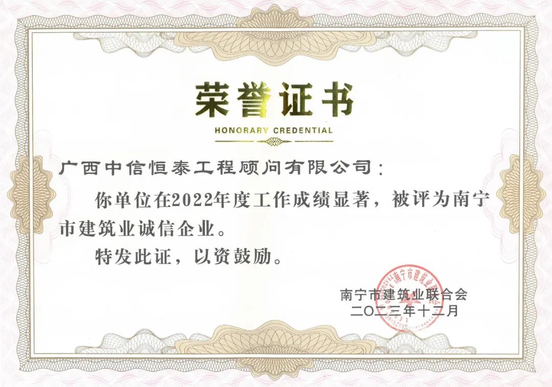 ◎中信恒泰榮獲2022年度“南寧市建筑業(yè)誠信企業(yè)”稱號