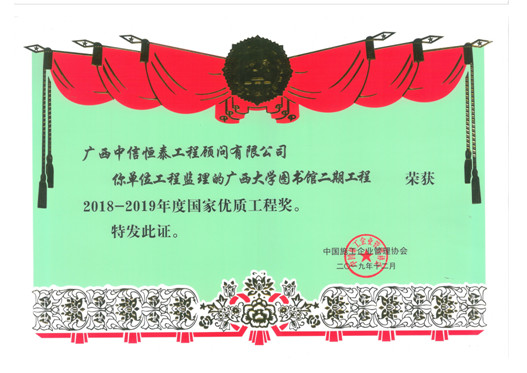 2019年國(guó)家優(yōu)質(zhì)工程獎(jiǎng)總結(jié)表彰大會(huì)于12月8日在國(guó)家會(huì)議中心舉行。會(huì)議對(duì)榮獲2018-2019年度國(guó)家優(yōu)質(zhì)工程獎(jiǎng)項(xiàng)目進(jìn)行表彰,廣西中信恒泰工程顧問有限公司監(jiān)理的項(xiàng)目再獲三項(xiàng)國(guó)優(yōu)大獎(jiǎng),分別為方特東盟神話景觀工程、廣西大學(xué)圖書館二期工程、門急診醫(yī)技大樓工程。截止目前,中信恒泰共有9項(xiàng)工程獲得此項(xiàng)殊榮。