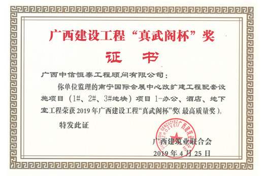 由廣西建筑業(yè)聯(lián)合會(huì)組織評(píng)選的2019年廣西建設(shè)工程“真武閣杯”獎(jiǎng)(最高質(zhì)量獎(jiǎng))和2019年廣西建設(shè)工程優(yōu)質(zhì)結(jié)構(gòu)獎(jiǎng),廣西中信恒泰工程顧問有限公司監(jiān)理的南寧國(guó)際會(huì)展中心改擴(kuò)建工程配套設(shè)施項(xiàng)目(1#、2#、3#地塊)項(xiàng)目、南寧市邕江綜合整治和開發(fā)利用工程(北岸:邕江濱水公園東側(cè)-三岸大橋)等12個(gè)項(xiàng)目榮獲2019年廣西建設(shè)工程“真武閣杯”獎(jiǎng)。