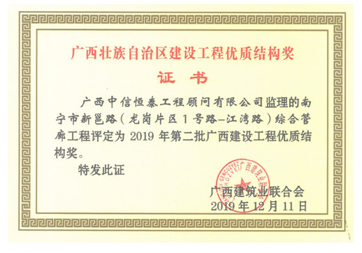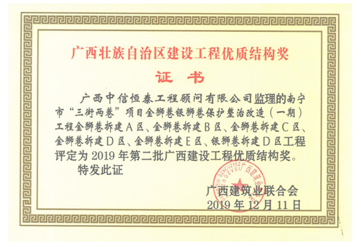 南寧市“三街兩巷”項(xiàng)目金獅巷銀獅巷保護(hù)整治改造(一期)工程、南寧市新邕路(龍崗片區(qū)1號(hào)路-江灣路)綜合管廊工程等29個(gè)項(xiàng)目榮獲2019年廣西建設(shè)工程優(yōu)質(zhì)結(jié)構(gòu)獎(jiǎng)。