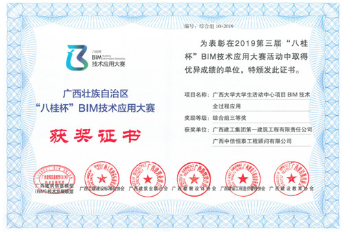 “廣西大學(xué)大學(xué)生活動(dòng)中心項(xiàng)目BIM技術(shù)全過程應(yīng)用”榮獲第三屆“八桂杯”BIM技術(shù)應(yīng)用大賽綜合組三等獎(jiǎng)。