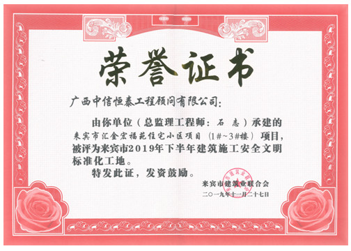 2019年,中信恒泰獲得眾多榮譽(yù)獎(jiǎng)項(xiàng): 2018年南寧市建設(shè)工程“邕城杯”獎(jiǎng)、2018年玉林市建設(shè)工程“萬花樓杯”獎(jiǎng)、2019年北海市“珠城杯”獎(jiǎng)、桂林市第十八屆“桂花杯”暨2019年度優(yōu)質(zhì)工程(金獎(jiǎng))、柳州市第二十九屆建設(shè)工程質(zhì)量“龍城杯”獎(jiǎng)、2019年防城港市優(yōu)質(zhì)工程獎(jiǎng)等20項(xiàng)市級(jí)優(yōu)質(zhì)工程獎(jiǎng)、38項(xiàng)各地市的安全文明工地、16項(xiàng)市級(jí)優(yōu)質(zhì)結(jié)構(gòu)獎(jiǎng)。