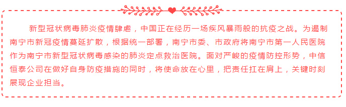 沒有一個冬天不可逾越,沒有一場戰(zhàn)役不可戰(zhàn)勝。此次抗疫工作中,中信恒泰正在用自己的實際行動,用自己的方式,為抗疫工作貢獻著充滿大愛的力量。我們愿與全市人民一起共度難關,同心協(xié)力一道打贏這場抗擊新型冠狀病毒的健康保衛(wèi)戰(zhàn)!