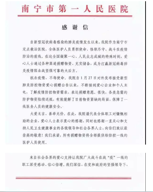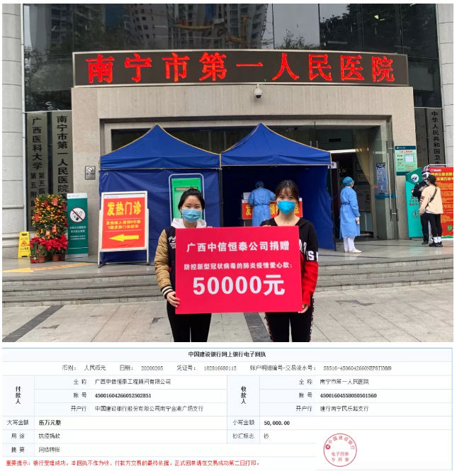 1月27日,南寧市第一人民醫(yī)院對外發(fā)布接受新型肺炎防控物資愛心捐贈的倡議書。一方有難,八方支援,在這次對抗新型冠狀病毒疫情的“戰(zhàn)役”中,中信恒泰向南寧市第一人民醫(yī)院捐款50000元用于抗擊新型冠狀病毒感染的肺炎疫情的防控工作,積極為抗擊疫情貢獻力量。