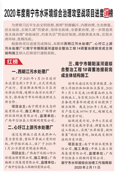 日前,南寧市水環(huán)境綜合治理指揮部在南寧日報上公示了《2020年度南寧市水環(huán)境綜合治理攻堅戰(zhàn)項目進度紅榜》,對進入紅榜的項目進行了通報表揚。由中信恒泰負責監(jiān)理的西明江污水處理廠、心圩江上游污水處理廠、南寧市朝陽溪河道綜合整治工程三個項目位列其中,中信恒泰也因此榮登紅榜。這不僅展示了中信恒泰在工程監(jiān)理方面取得的成績,也體現(xiàn)了南寧市水環(huán)境綜合治理指揮部對中信恒泰工程監(jiān)理方面的肯定。