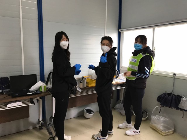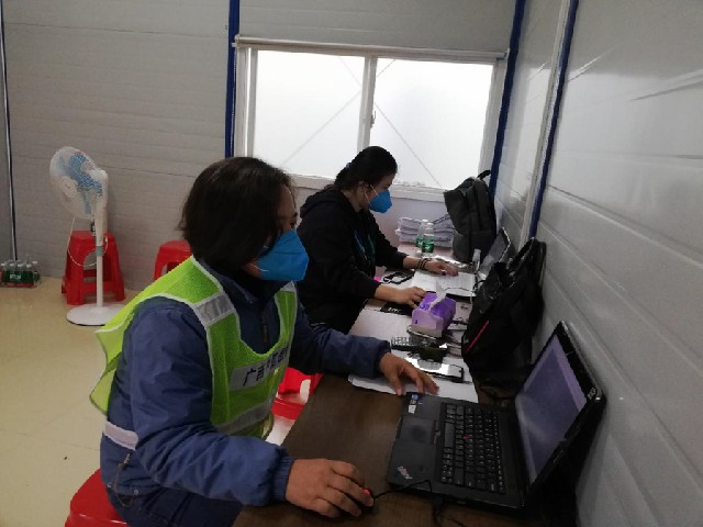 圖為資料組鄧麗娟每天為現(xiàn)場(chǎng)人員測(cè)量體溫