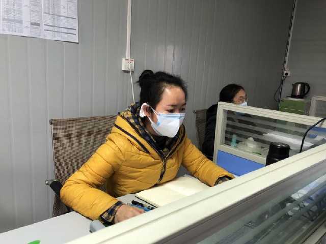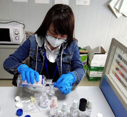 圖為資料組黃倩分發(fā)酒精,每天進(jìn)行酒精消毒,保障一線工作人員的安全防護(hù)