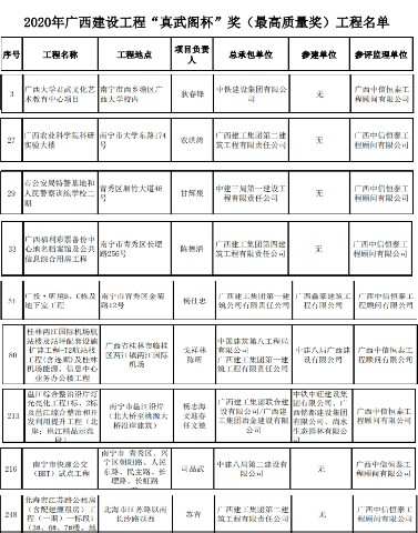 此次獲獎的9個項(xiàng)目分別是:廣西大學(xué)君武文化藝術(shù)教育中心項(xiàng)目,廣西農(nóng)業(yè)科學(xué)院科研實(shí)驗(yàn)大樓,南寧市公安局特警基地和人民警察訓(xùn)練學(xué)校二期,廣西福利彩票備份中 心地名檔案館及公共信息綜合用房工程,廣投·昕境B、C棟及地下室工程,桂林兩江國際機(jī)場航站樓及站坪配套設(shè)施擴(kuò)建工程-T2航站樓工程(含連廊)及桂林機(jī)場能源、信息中心業(yè)務(wù)辦公樓工程,邕江綜合整治沿岸燈光亮化工程1標(biāo)、2標(biāo)及邕江綜合整治和開發(fā)利用提升工程(北岸:邕江精品示范段),南寧市快速公交(BRT)試點(diǎn)工程,北海市江蘇路公租房(含配建廉租房)工程(一期)一標(biāo)段1(3#、6#、7#樓、地)。