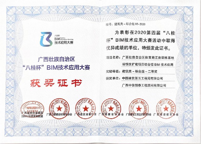 近日,由廣西壯族自治區(qū)住房和城鄉(xiāng)建設(shè)廳指導(dǎo),廣西建筑信息模型(BIM)技術(shù)發(fā)展聯(lián)盟、廣西工程建設(shè)標(biāo)準(zhǔn)化協(xié)會(huì)、廣西建筑業(yè)聯(lián)合會(huì)、廣西勘察設(shè)計(jì)協(xié)會(huì)、廣西建設(shè)工程造價(jià)管理協(xié)會(huì)、廣西建設(shè)教育協(xié)會(huì)聯(lián)合主辦,廣西建筑信息模型(BIM)技術(shù)發(fā)展聯(lián)盟承辦的2020第四屆“八桂杯”BIM技術(shù)應(yīng)用大賽頒獎(jiǎng)大會(huì)在南寧隆重舉行!中信恒泰的全過(guò)程咨詢項(xiàng)目—廣西壯族自治區(qū)體育局江南訓(xùn)練基地場(chǎng)館改擴(kuò)建項(xiàng)目BIM技術(shù)應(yīng)用獲得了廣西“八桂杯”BIM大賽建筑類綜合組二等獎(jiǎng),這是中信恒泰在“八桂杯”中第二次獲獎(jiǎng),再一次彰顯了中信恒泰在BIM技術(shù)方面的強(qiáng)大實(shí)力。
