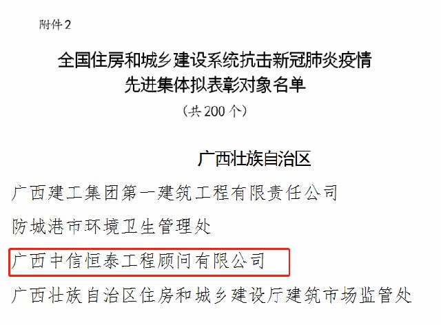 12月8日,中國住房和城鄉(xiāng)建設(shè)部公示了全國住房和城鄉(xiāng)建設(shè)系統(tǒng)抗擊新冠肺炎疫情先進(jìn)個(gè)人和先進(jìn)集體的表彰名單。中信恒泰在疫情期間凝聚力量、迅速響應(yīng)、主動(dòng)作為,勇于擔(dān)當(dāng),從眾多先進(jìn)單位和企業(yè)中脫穎而出,榮膺“全國住房和城鄉(xiāng)建設(shè)系統(tǒng)抗擊新冠肺炎疫情先進(jìn)集體”。