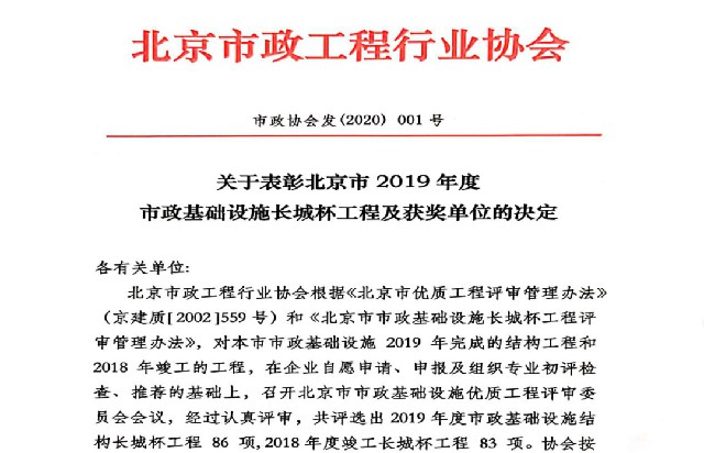 中信恒泰PPP項目榮獲北京市2019年度市政基礎設施長城杯銀獎