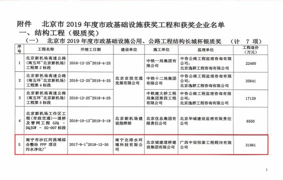 近日,由廣西中信恒泰工程顧問有限公司監(jiān)理的南寧市沙江河流域綜合整治PPP項目喜獲“北京市2019年度市政基礎設施長城杯工程”。