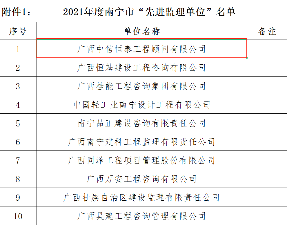 中信恒泰榮獲2021年度南寧市“先進(jìn)監(jiān)理單位”稱號(hào)