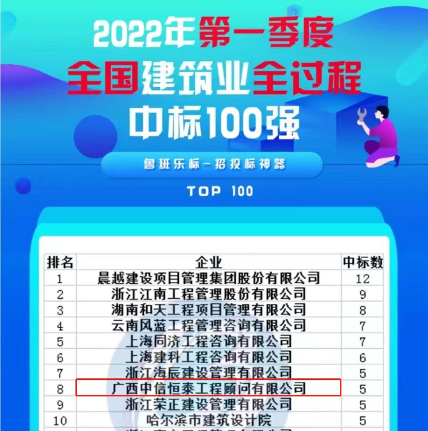 近日,根據魯班樂標發(fā)布的全國2022年第一季度全過程工程咨詢中標百強榜單顯示,中信恒泰持續(xù)穩(wěn)居全國第一梯隊,廣西榜首,又一次彰顯中信恒泰全過程工程咨詢服務的卓越實力和品牌優(yōu)勢。
