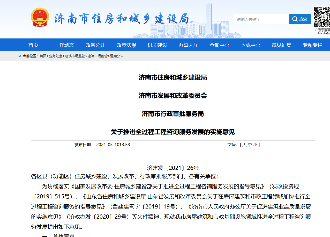 近日,濟南市住房和城鄉(xiāng)建設(shè)局聯(lián)合濟南市發(fā)展和改革委員會、濟南市行政審批服務(wù)局印發(fā)了《關(guān)于推進全過程工程咨詢服務(wù)發(fā)展的實施意見》。