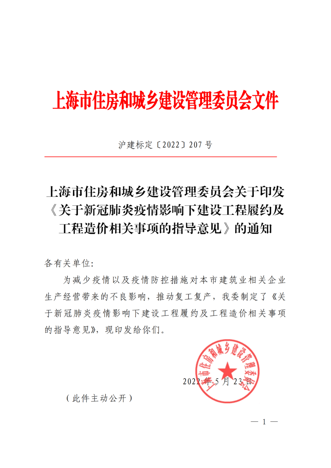 上海市住房和城鄉(xiāng)建設管理委員會關于印發(fā) 《關于新冠肺炎疫情影響下建設工程履約及工程造價相關事項的指導意見》的通知