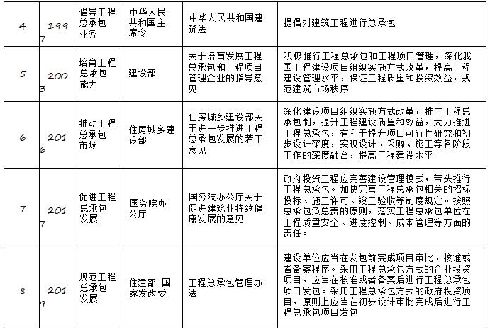 2016年隨著住建部發(fā)布《住房城鄉(xiāng)建設(shè)部關(guān)于進(jìn)一步推進(jìn)工程總承包發(fā)展的若干意見》:“深化建設(shè)項(xiàng)目組織實(shí)施方式改 革,推廣工程總承包制,提升工程建設(shè)質(zhì)量和效益,大力推進(jìn)工程總承包,有利于提升項(xiàng)目可行性研究和初步設(shè)計(jì)深度,實(shí)現(xiàn)設(shè)計(jì)、采購、施工等各階段工作的深度融合,提高工程建設(shè)水平”的提出,工程總承包逐步在房屋建筑和市政領(lǐng)域全面展開,工程總承包進(jìn)入了一個(gè)快速發(fā)展期,工程總承包發(fā)展歷程詳下表: