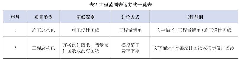 施工總承包模式和工程總承包模式下工程范圍的表達(dá)方式是不同的,具體詳下表: