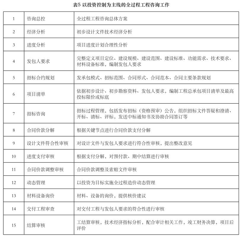 全過程工程咨詢工作主要包括項(xiàng)目總控、經(jīng)濟(jì)分析、進(jìn)度分析、發(fā)包人要求編制、招標(biāo)合約規(guī)劃、項(xiàng)目清單及最高限價(jià)或標(biāo)底編制、招標(biāo)咨詢、合同價(jià)款分解、設(shè)計(jì)文件符合性審核、進(jìn)度支付審核、合同價(jià)款調(diào)整審核、造價(jià)動(dòng)態(tài)管理、材料設(shè)備詢價(jià)、交付工程審查、結(jié)算審核等工作構(gòu)成,具體詳下表: