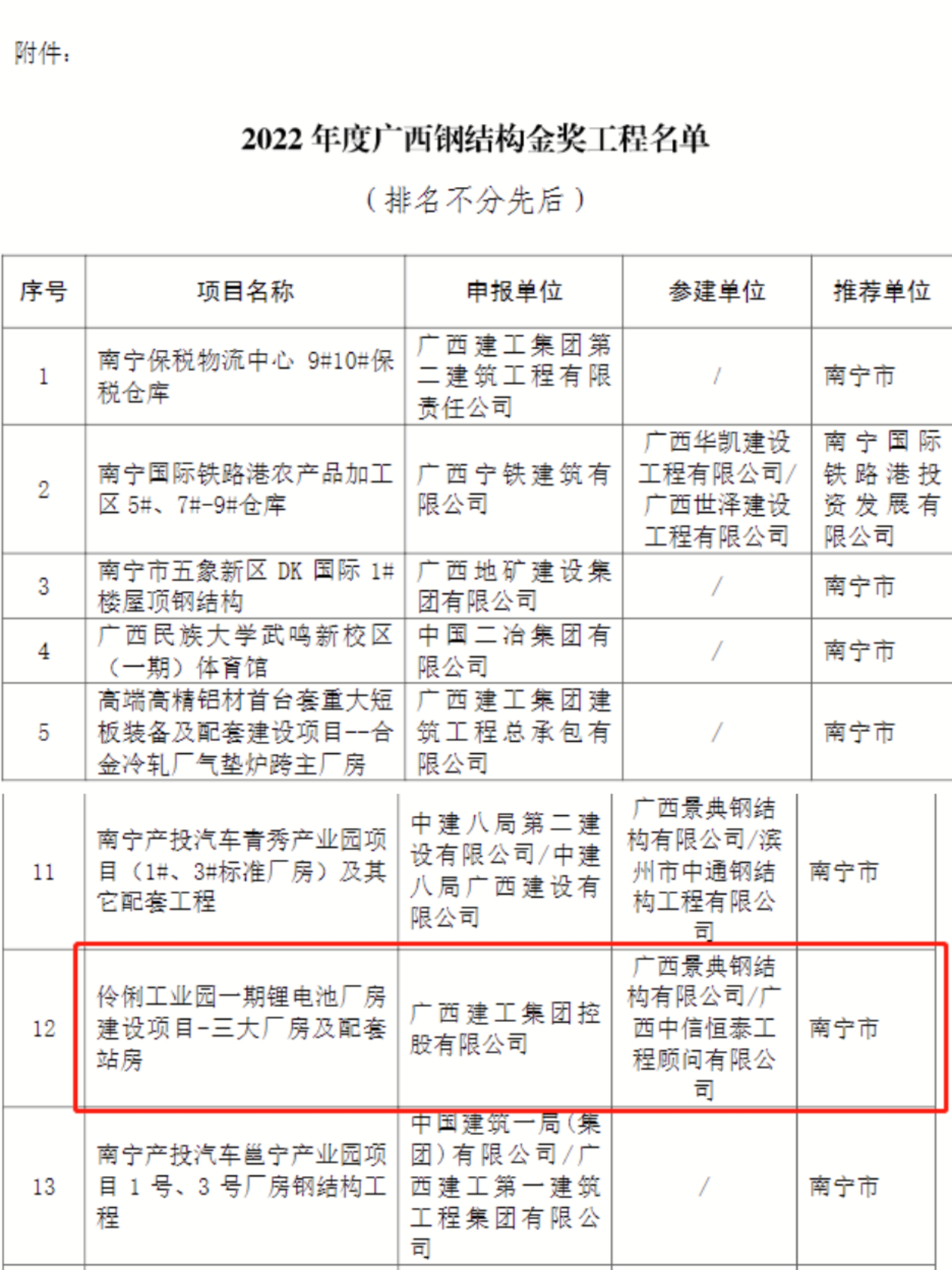 近日,廣西建筑業(yè)聯(lián)合會公布了2022年度廣西鋼結(jié)構(gòu)金獎工程名單,中信恒泰參建的伶俐工業(yè)園一期鋰電池廠房建設(shè)項目-三大廠房及配套站房項目榜上有名,喜獲2022年度“廣西鋼結(jié)構(gòu)金獎”殊榮。