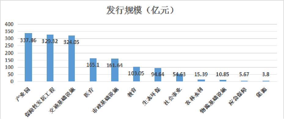 主要發(fā)行領(lǐng)域:產(chǎn)業(yè)園基礎(chǔ)設(shè)施、保障性安居工程、交通基礎(chǔ)設(shè)施三類項(xiàng)目金額最大,均超過了300億元發(fā)行規(guī)模