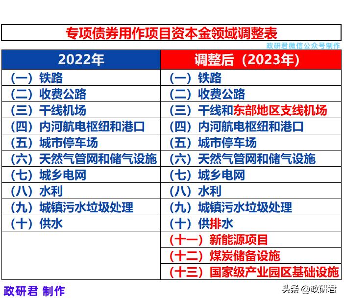 近期監(jiān)管部門明確(2023年投向),可用作項目資本金的領(lǐng)域在原有10個領(lǐng)域的基礎(chǔ)上增加新能源項目、煤炭儲備設(shè)施、國家級產(chǎn)業(yè)園區(qū)基礎(chǔ)設(shè)施3項,專項債可作資本金領(lǐng)域由此擴大至13項。