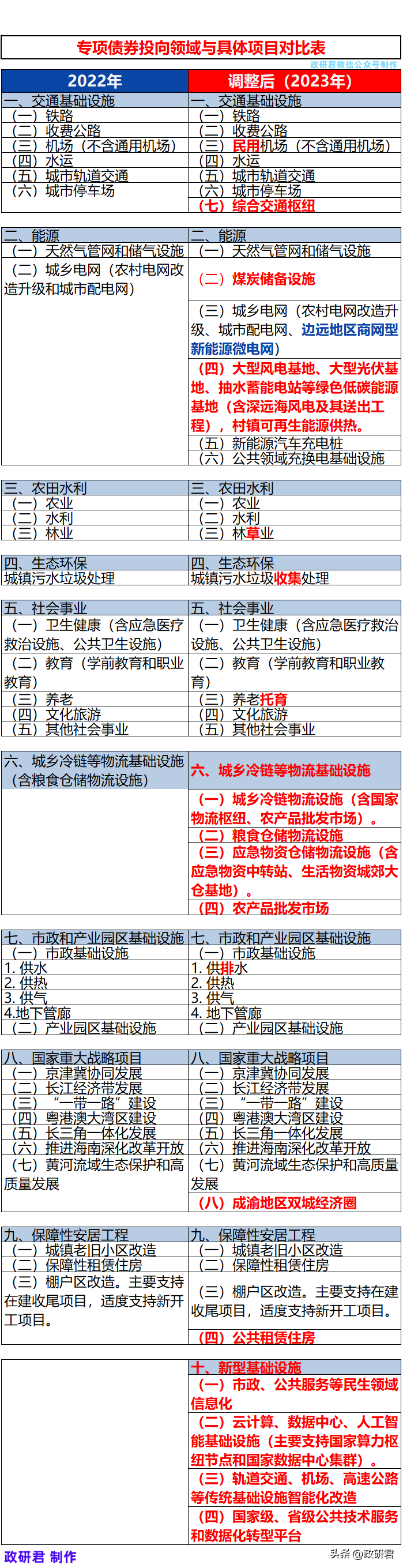 二、專項債券投向領(lǐng)域與具體項目對比表