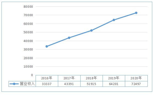 “十三五”期間,企業(yè)累計(jì)營業(yè)收入為26 5341.54億,年均53 068.31億。期末數(shù)為72 497億元,比期初數(shù)33 337億元增加39 160億元,增長117.47%,年化增長率為16.81%。