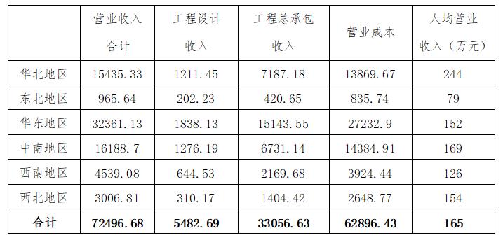 從上表分析可以看出,營業(yè)收入合計(jì)中,華東、中南、華北地區(qū)較高,西南地區(qū)中間,西北、東北較低。營業(yè)收入最高的是北京市10 743.14億元,較高的省份依次為:上海市8 711.76億元,廣東省6 723.00億元,江蘇省6 103.18億元,山東省5 324.34億元。最少的省份是西藏自治區(qū)31.93億元,較少的省份依次為:寧夏回族自治區(qū)31.56億元,青海省35.69億元,海南省79.83億元。工程設(shè)計(jì)收入中,華東最高,中南、華北較高,東北、西北、西南相對(duì)較低。工程設(shè)計(jì)收入最多的是北京市793.94億元,較多的省份依次為:廣東省597.11億元,上海市520.02億元,江蘇省406.69億元,浙江省393.42億元,均超過300億元。最少的省份是西藏自治區(qū)15.27億元,較少的省份依次為:寧夏回族自治區(qū)13.19億元,青海省14.39億元,海南省17.40億元,均沒有超過20億元。工程總承包收入中,華東最高,華北、中南較高,東北、西北、西南相對(duì)較低。工程總承包收入最高的是北京市5 350.00億元,較高的省份依次為:上海市3 806.91億元,廣東省3 210.77億元,江蘇省2 878.48億元,山東省2 624.58億元,均超過2 500億元。最少的省份是西藏自治區(qū)3.06億元,較少的省份依次為:寧夏回族自治區(qū)9.99億元,青海省11.22億元,海南省29.82億元,均沒有超過30億元。營業(yè)成本中,華東最高,中南、華北較高,東北、西北、西南較低。人均營業(yè)收入中,華北最高,中南較高,西北、華東、西南稍低,彼此相差不大,東北明顯偏低。人均營業(yè)收入超過200萬元的省份依次為:天津市345萬元/人,上海市294萬元/人,湖南省273萬元/人,北京市265萬元/人,山東省216萬元/人,湖北省212萬元/人。人均營業(yè)收入低于60萬元的省份依次為:青海省50萬元/人,西藏、寧夏回族自治區(qū)均為55萬元/人。