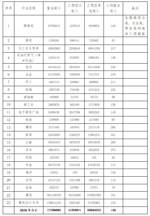 2020年工程勘察設(shè)計(jì)行業(yè)營業(yè)收入水平及指標(biāo)表(單位:萬元)