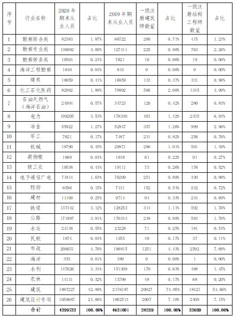 2020年年末,全國工程勘察設(shè)計(jì)注冊(cè)執(zhí)業(yè)人數(shù)合計(jì)63.77萬人,比2019年增加100 670人,增長18.75%。其中一級(jí)注冊(cè)建筑師28 259人,比2019年增加2 844人,增長11.19%,二級(jí)注冊(cè)建筑師12 989人,比2019年減少70人,降低0.54%;一級(jí)注冊(cè)結(jié)構(gòu)工程師33 699人,比2019年增加2 306人,增長7.35%,二級(jí)注冊(cè)結(jié)構(gòu)工程師7 271人,比2019年增加314人,增長4.51%;注冊(cè)土木(巖土)工程師1 6095人,比2019年增加2 105人,增長15.05%;注冊(cè)公用設(shè)備工程師27 201人,比2019年增加3 004人,增長12.41%;注冊(cè)電氣工程師18 496人,比2019年增加1 742人,增長10.40%;注冊(cè)化工工程師5 346人,比2019年增加277人,增長5.46%;注冊(cè)城鄉(xiāng)規(guī)劃師11 508人,比2019年增加1 977人,增長20.74%;注冊(cè)監(jiān)理工程師31 397人,比2019年增加4 766人,增長17.90%;注冊(cè)造價(jià)工程師40 310人,比2019年增加9 579人,增長31.17%;一級(jí)注冊(cè)建造師221 242人,比2019年增加56 493人,增長34.29%,二級(jí)注冊(cè)建造師144 655人,比2019年增加6 877人,增長4.99%;其他注冊(cè)工程師39 225人,比2019年增加8 456人,增長27.48%。