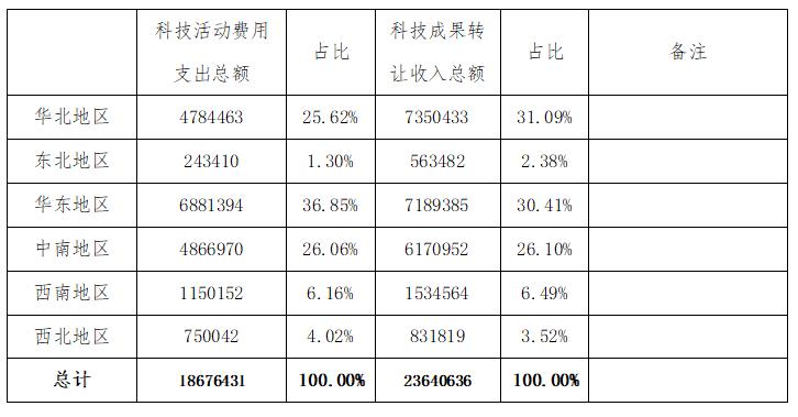 按地區(qū)分,各大區(qū)科技活動(dòng)費(fèi)用支出總額和科技成果轉(zhuǎn)讓收入總額見下表: