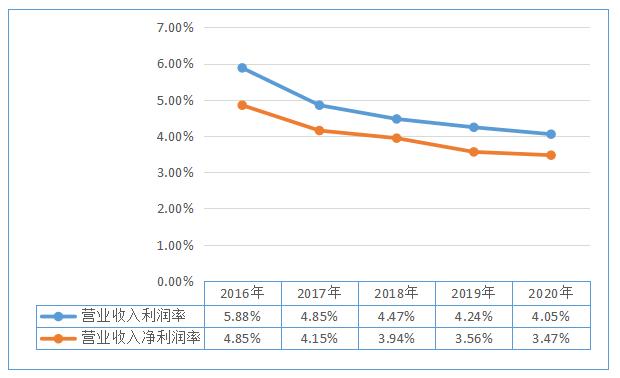 “十三五”期間,營業(yè)收入利潤率期末數(shù)為4.05%,比期初數(shù)5.88%減少1.83個(gè)百分點(diǎn),降低31.12%,年化降低率為7.19%;營業(yè)收入凈利潤率期末數(shù)為3.47%,比期初數(shù)4.85%減少1.38個(gè)百分點(diǎn),降低28.45%,年化降低率為6.48%。