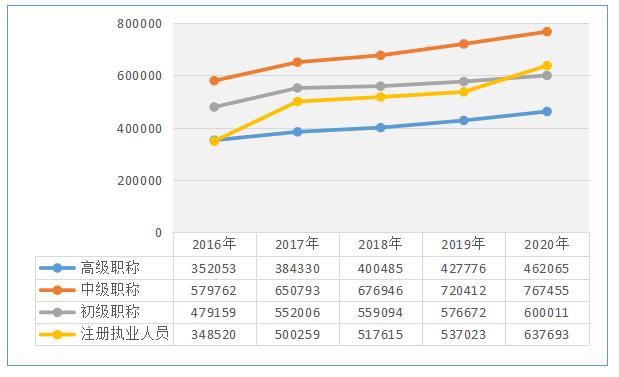 2020年全行業(yè)專業(yè)技術(shù)人員中,具有高級(jí)職稱的為46.21萬人,比2019年增加3.43萬人,增長8.02%;中級(jí)職稱76.75萬人,比2019年增加4.70萬人,增長6.53%;初級(jí)職稱60.00萬人,比2019年增加2.33萬人,增長4.05%。注冊(cè)執(zhí)業(yè)人員63.77萬人,比2019年增加10.07萬人,增長18.75%。