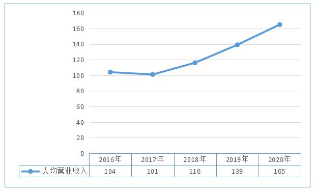 “十三五”期間,行業(yè)人均營業(yè)收入數(shù)量期末數(shù)為165萬元,比期初數(shù)104萬元增加61萬元,增長58.65%,年化增長率為9.67%。