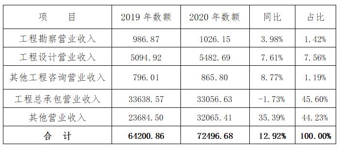2020年全國工程勘察設(shè)計(jì)行業(yè)營業(yè)收入合計(jì)72 496.68億元(其中境外營業(yè)收入1 728.08億元),比2019年增長12.92%。其中:工程勘察營業(yè)收入1 026.15億元(其中境外收入9.75億元),占全行業(yè)收入(下同)1.42%,比2019年增加3.98%;工程設(shè)計(jì)營業(yè)收入5 482.69億元(其中境外營業(yè)收入73.26億元),占7.56%,比2019年增長7.61%;其他工程咨詢營業(yè)收入865.80億元(其中境外營業(yè)收入7.75億元),占1.19%,比2019年增長8.77%;工程總承包營業(yè)收入33 056.63億元(其中境外營業(yè)收入1 454.48億元),占45.60%,比2019年降低1.73%;其他營業(yè)收入32 065.41億元,占44.23%,比2019年增長35.39%(自2017年起,住建部統(tǒng)計(jì)年報(bào)中不再列示工程施工營業(yè)收入、其他營業(yè)收入。為了保持?jǐn)?shù)據(jù)的完整性,本報(bào)告采用“其他營業(yè)收入=營業(yè)收入-勘察-設(shè)計(jì)-咨詢-總承包”予以處理)。
